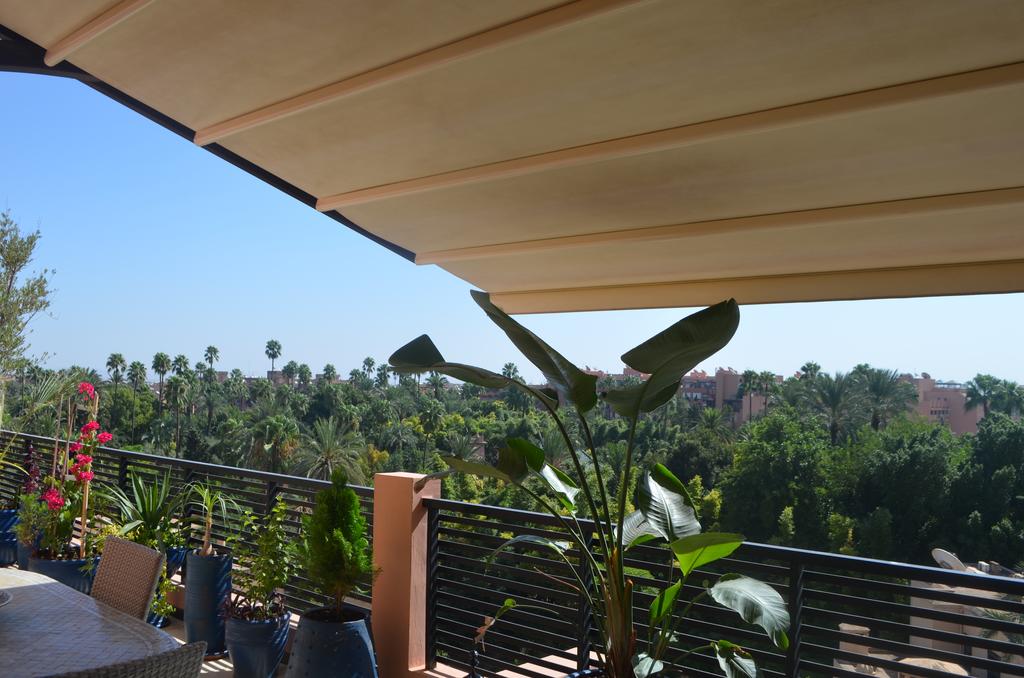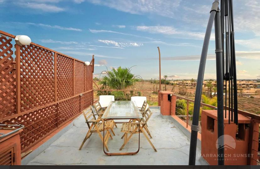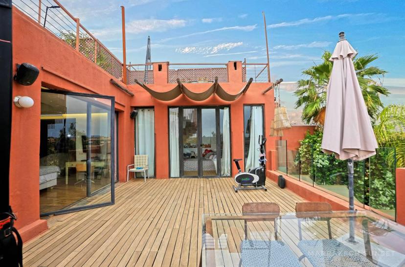 Un autre escalier qui mène à la terrasse supérieure avec un beau coin salon, une petite cuisine et une table à manger pour profiter de barbecue en famille ou tout simplement pour profiter d’un verre surplombant le magnifique coucher de soleil de Marrakech.