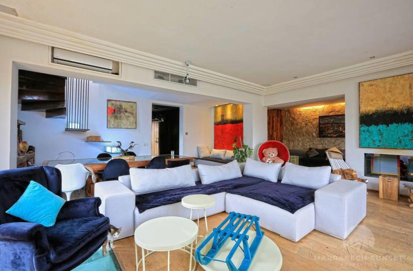 Ab Development Marrakech vous propose à la vente cette villa de galerie d’art incroyable qui dispose d’une fabuleuse collection d’art moderne et de sculptures dans un but de mélange éclectique de vintage, contemporain et traditionnel avec l’accent sur le confort. Edifiée sur un terrain total de 700 m² et construite sur une superficie de 350 m² sans vis-à-vis.