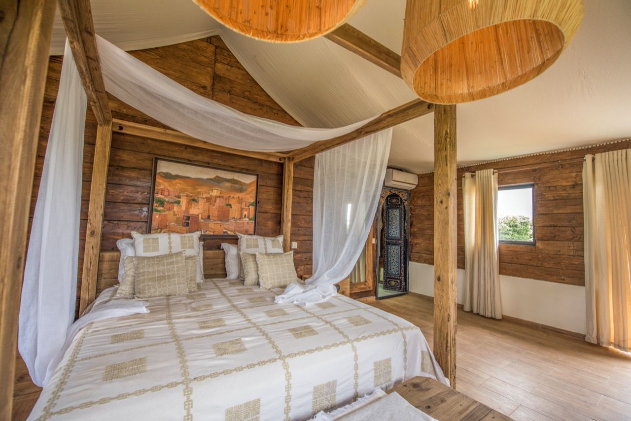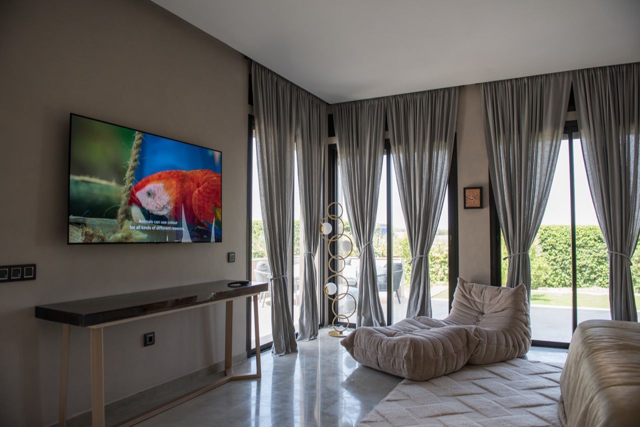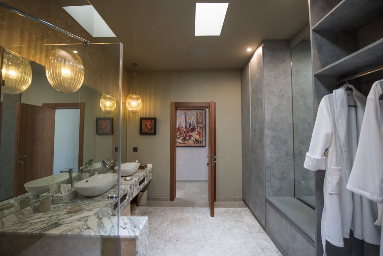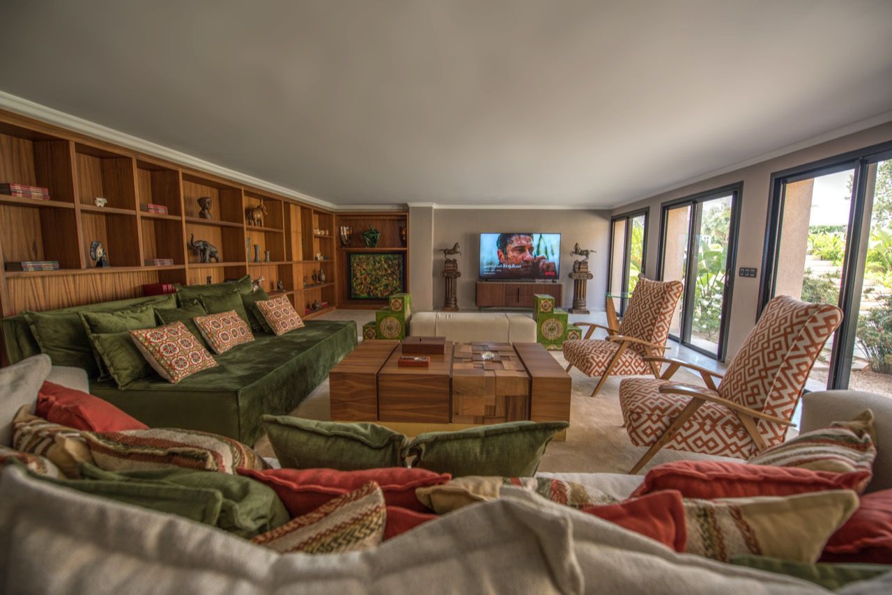 La Villa la Rose des Sables se décline en un double salon avec cheminée traversante; l’espace entre la salle à manger et le salon offre une vue unique sur les montagnes de l’Atlas et ceci grâce à de larges baies vitrées, baignées de lumière.