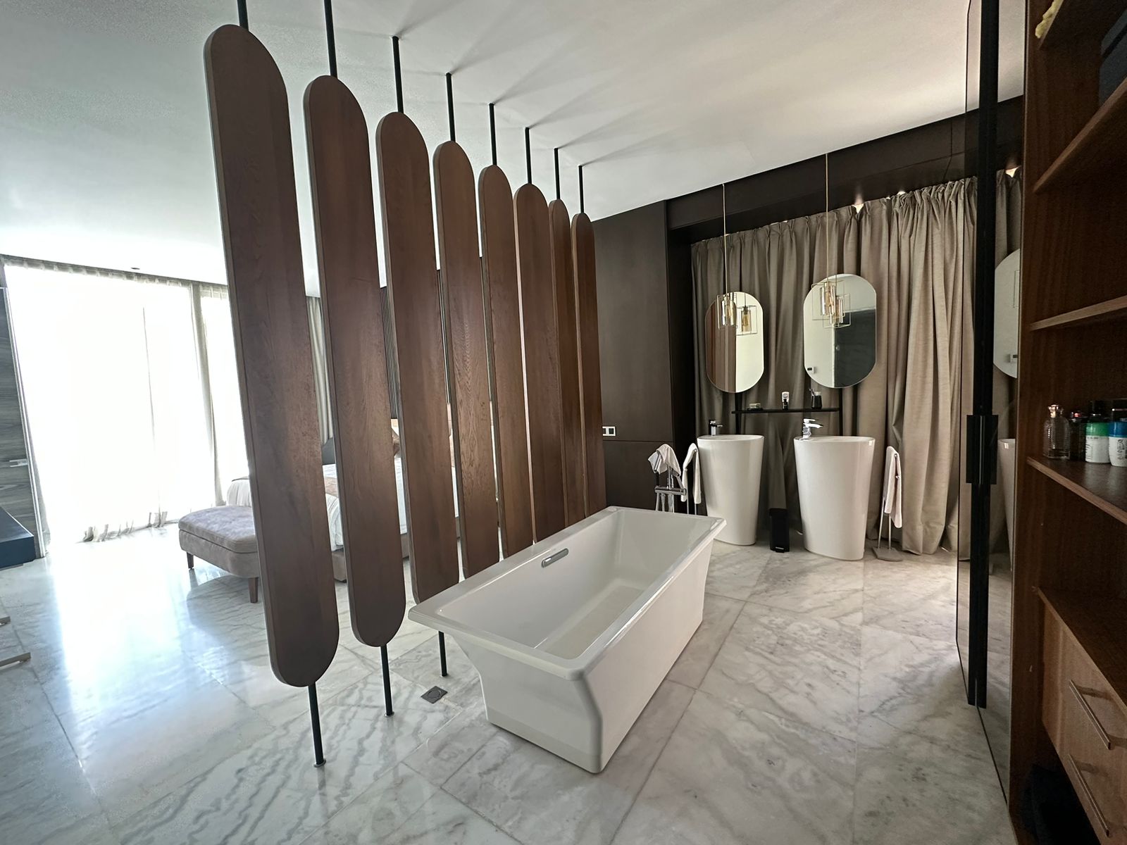 On y trouve également une grande cuisine américaine entièrement équipée avec un logement pour le personnel ainsi qu’une grande suite avec salle de bain douche et baignoire , dressing et bureau avec salle de bain douche