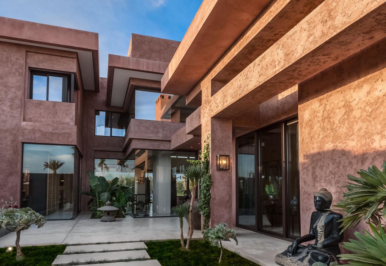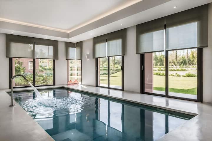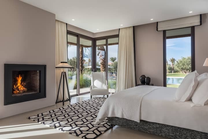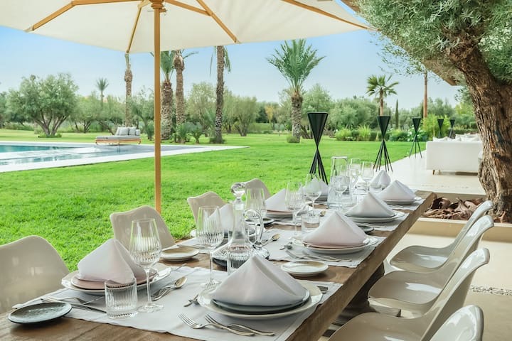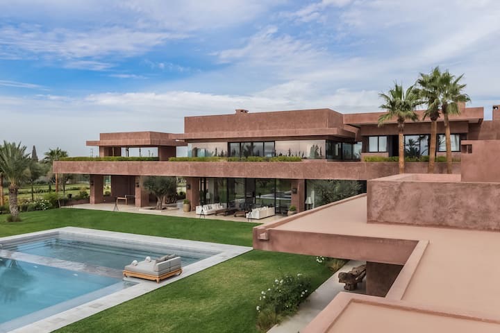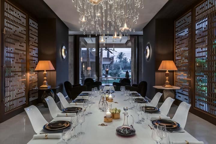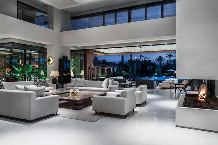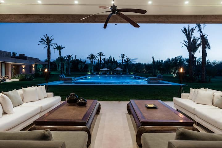 C’est l’une des trois plus belle Villa de Marrakech. Le luxe est sans limite dans cette villa qui offre 2 masters suites et cinq très belles chambres, trois chambres avec salles de bains sont ouvertes sans supplément. De très beaux salons intérieurs; Salon bar avec billard, Salon TV, salons panoramiques. Les salons extérieurs avec bar, ou à l’abri du vent sont équipés de brumisateurs et ventilateurs pour vous prémunir des fortes chaleurs de l’été. L’espace salle à manger est surplombée d’un piano de cuisine et une véritable salle de cinéma.