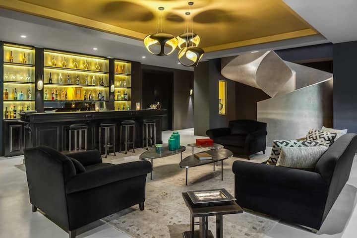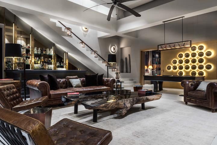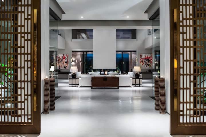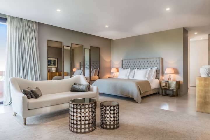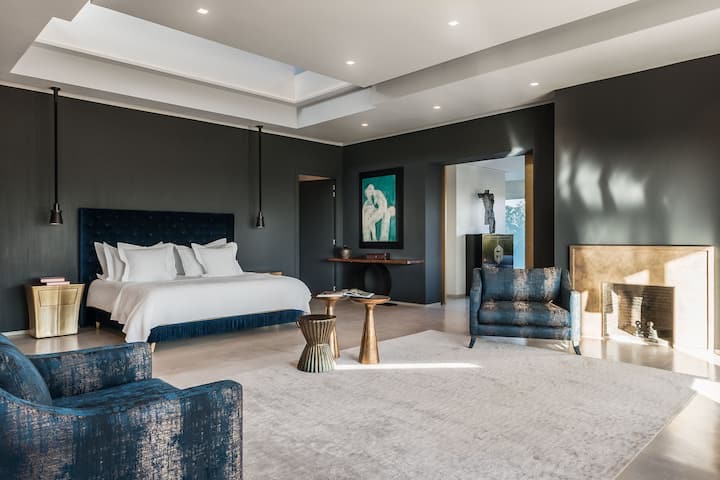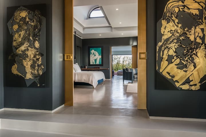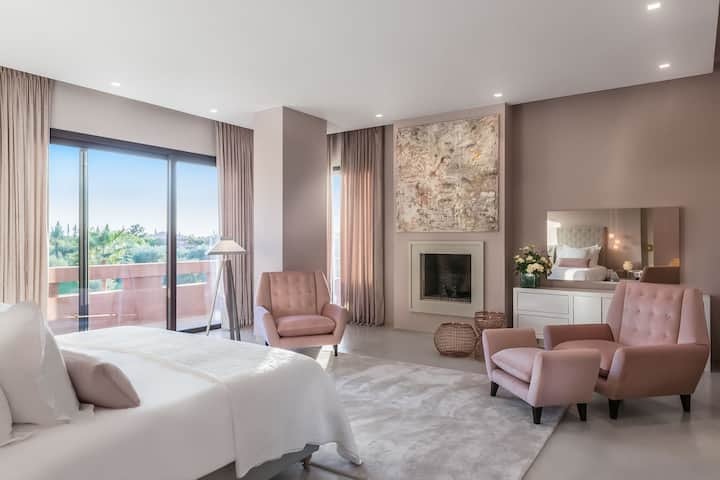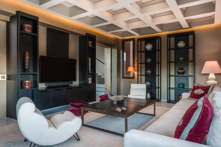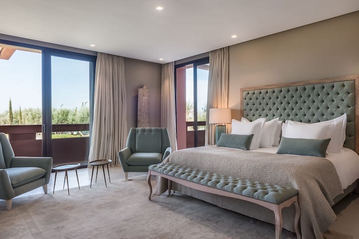 C’est l’une des trois plus belle Villa de Marrakech. Le luxe est sans limite dans cette villa qui offre 2 masters suites et cinq très belles chambres, trois chambres avec salles de bains sont ouvertes sans supplément. De très beaux salons intérieurs; Salon bar avec billard, Salon TV, salons panoramiques. Les salons extérieurs avec bar, ou à l’abri du vent sont équipés de brumisateurs et ventilateurs pour vous prémunir des fortes chaleurs de l’été. L’espace salle à manger est surplombée d’un piano de cuisine et une véritable salle de cinéma.